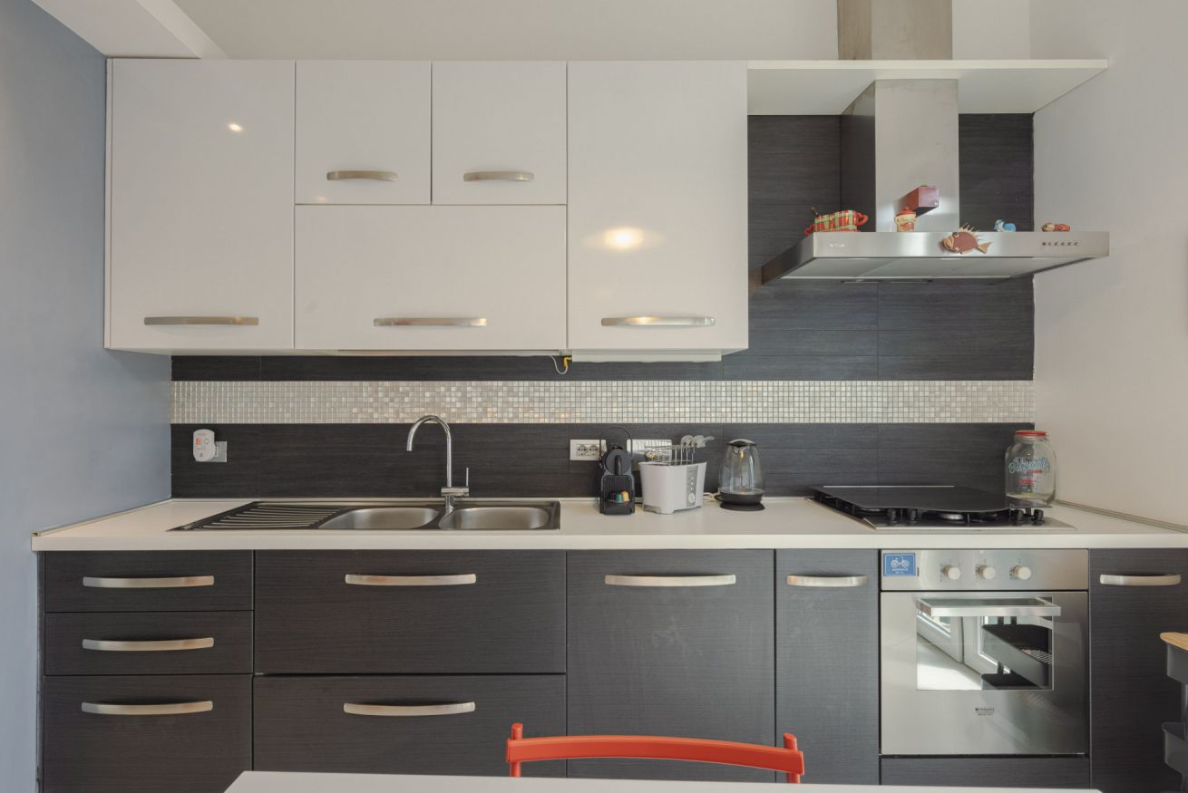 • Cucina completamente attrezzata con tutto l’occorrente: lavastoviglie, forno, frigorifero, freezer, piano cottura, macchina del caffè Nespresso, bollitore e tostapane